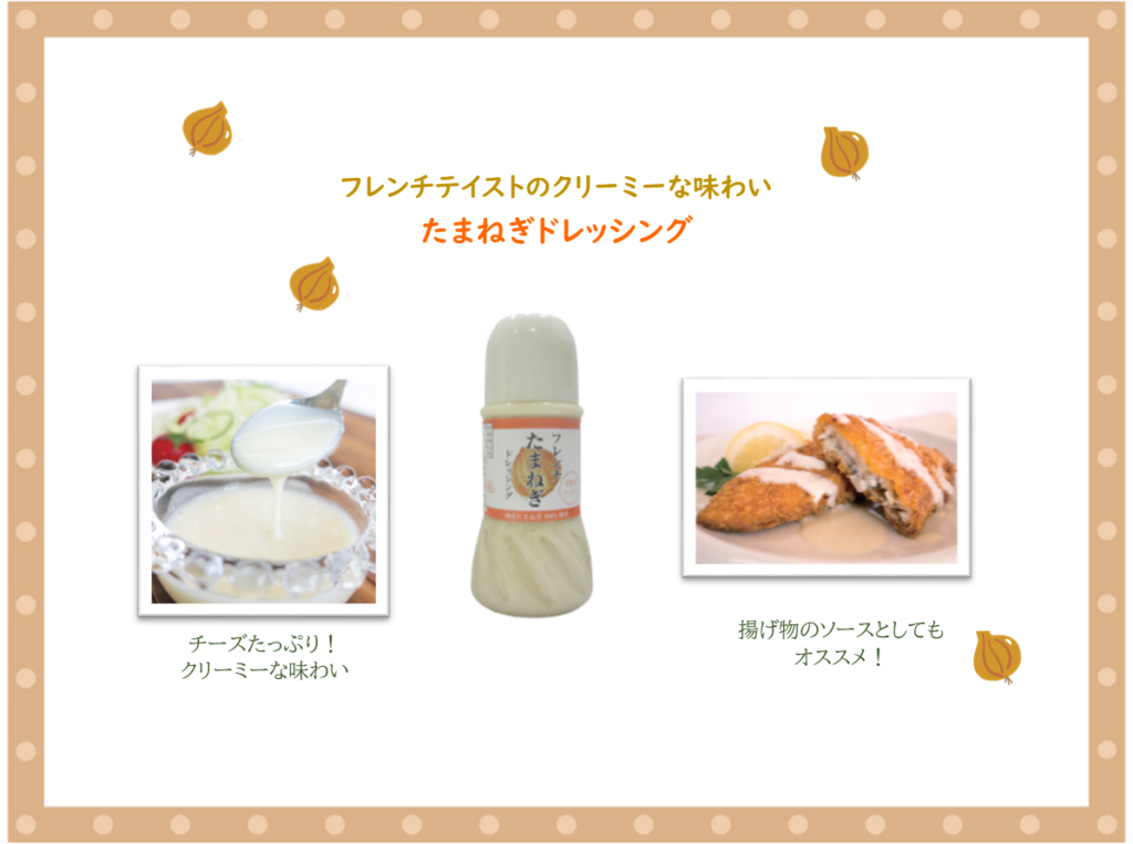 たっぷりのたまねぎにナチュラルチーズを加えて仕上げた、クリーミーなドレッシングです。甘酸っぱく、野菜との相性も抜群でお子様にもおすすめです!