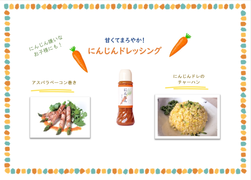 にんじん特有の臭みもなく、甘くてまろやかな味わいなので、にんじんが苦手なお子様でも食べやすいドレッシングです。