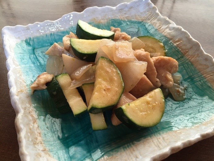- 鶏むね肉はひと口大、ズッキーニは7㎜程度の半月切り、玉ねぎは1㎝程度の角切り、エリンギは乱切りにする。